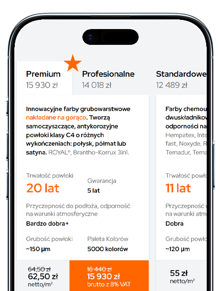 blachy trapezowe – T18 = 100 x 1,15 = 115 m2 całkowitej rzeczywistej powierzchni do malowania.